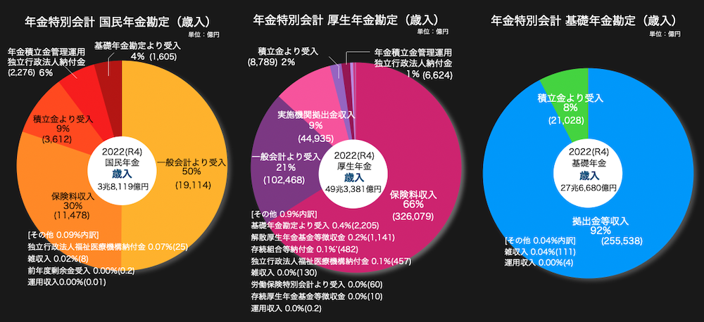 ここでは公的年金として徴収されている「基礎年金」「国民年金」「厚生年金」の歳入と歳出をグラフで示します。